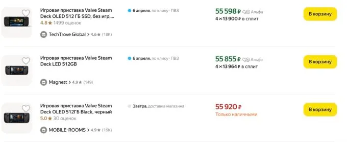 - Valve Steam Deck OLED 512 Гбайт — 55 600 рублей, прошлый месяц — 64 000 рублей