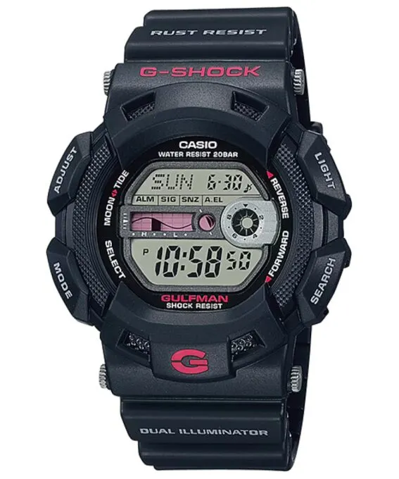 Задняя крышка Casio G-Shock G-9100-1E сделана из нержавеющей стали, а циферблат прикрывает минеральное стекло. Модель рассчитана на активную среду: влагозащита 200 WR позволяет использовать часы при погружениях с аквалангом. Среди прочих ключевых функций — светодиодная подсветка, таймер, секундомер, 5 будильников, автоматический календарь, отображение мирового времени и формат 12/24 часа.