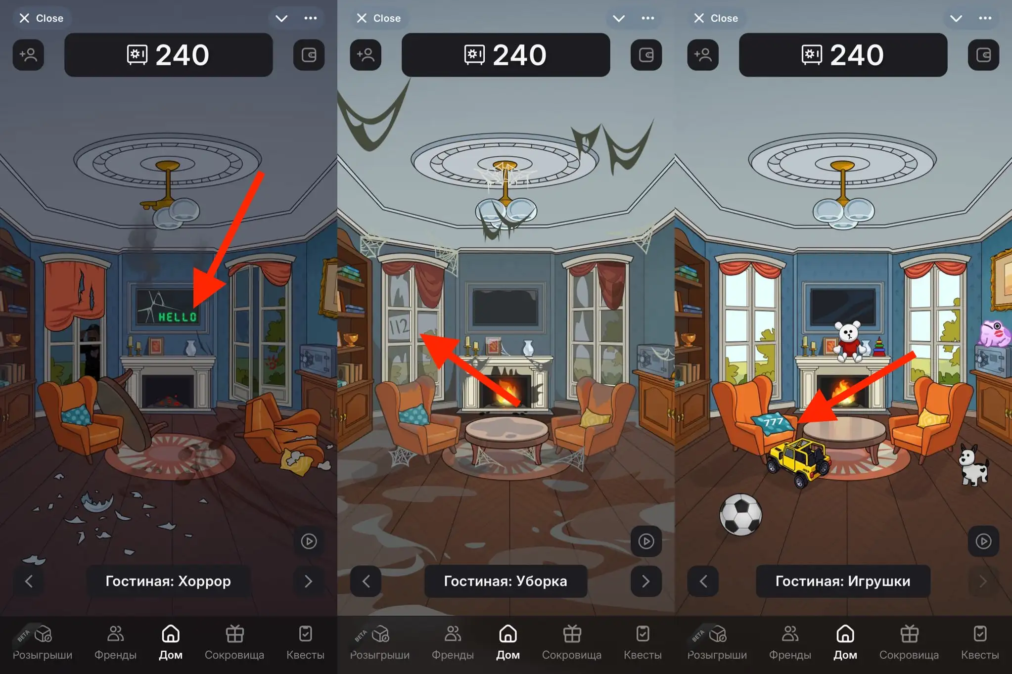 Механика простая: каждый день нужно запускать приложение и искать в комнатах скрытые символы или коды. Для этого нужно тапать по объектам в помещении, а затем вводить спрятанные коды в разделе «Квесты» и получать бонусные очки.