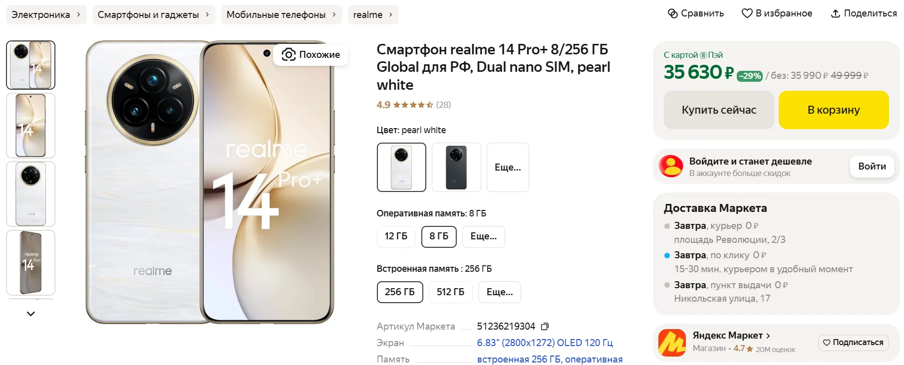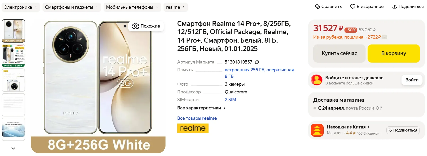 Однако если в приоритете именно фотовозможности, то у Realme 14 Pro+ нет альтернатив в этом сегменте. 31 530 рублей — отличный прайс, но у такого лота есть нюанс: доставка из-за рубежа. Она займет не меньше 10 дней, к тому же придется оплатить таможенную пошлину — примерно 2 720 рублей.