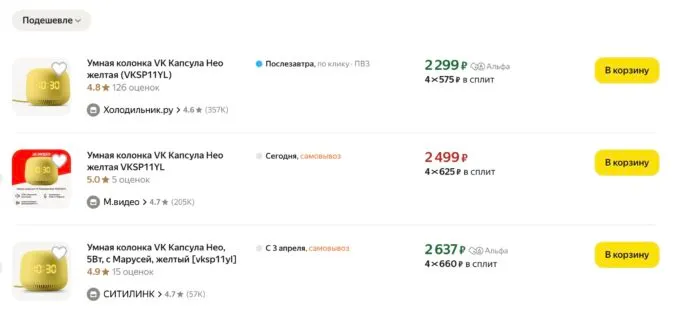 - «Яндекс Станция Мини» без часов — 7300 рублей, прошлый месяц — 8500 рублей