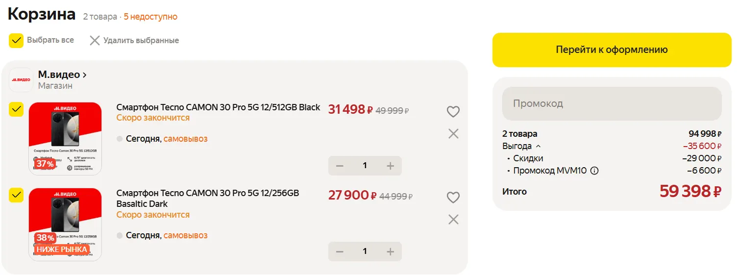 Впрочем, если фотовозможности важнее повышенной производительности и наличия влагозащиты, смело хватайте «камон»: младшая конфигурация на 12/256 Гбайт доступна за 27 900 рублей, а старшая с 512 Гбайт на накопителе — за 31,5К. А как получить такие ценники? Все просто: ныряйте на Маркет, добавляйте в корзину лот от продавца «М.Видео» и на стадии оформления заказа примените код MVM10, который и даст заветную скидку.
