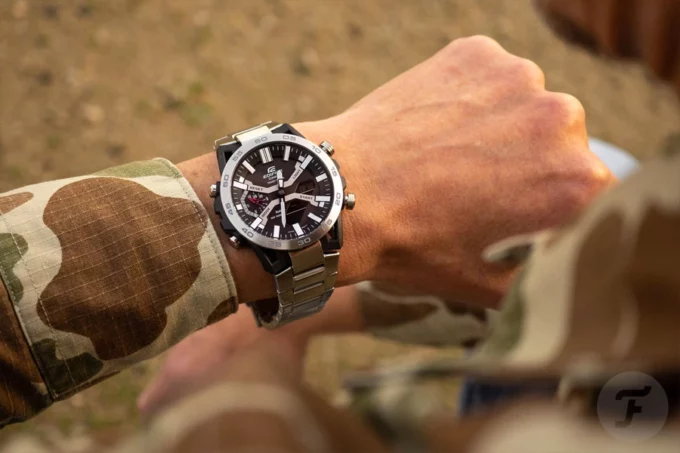 Часы «Хищника» из одноимённого фильма со Шварценеггером — Casio Edifice ECB-2000D-1A. Они и выглядят как хищник, и по начинке довольно крутые. Это технологичный гибрид в корпусе из стали и карбона, который подойдёт тем, кто ценит функциональность и современный стиль. В модели используется система Tough Solar, обеспечивающая до 7 месяцев работы без подзарядки, а при включённой функции энергосбережения в них можно ходить полтора года. Также часы предлагают подключение по Bluetooth к смартфону для автоматической коррекции времени и данных о временных зонах. Это особенно удобно в поездках.