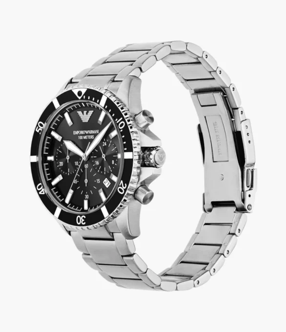 Разумеется, влагозащита у Armani Diver самая мощная — целых 100WR. Их можно спокойно использовать их в бассейне или на море, не опасаясь за механизм. Ещё в часах есть три мини-циферблата и окошко отображения даты. По такой цене их нельзя упускать.