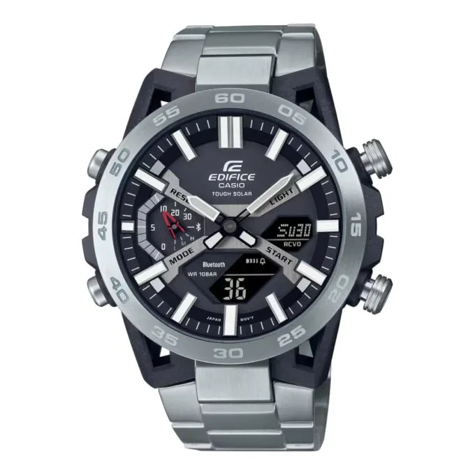 Также Casio Edifice ECB-2000D-1A оснащены секундомером с точностью 1/100 секунды, таймером, двойной подсветкой и мировым временем (38 городов). Минеральное стекло защищает циферблат, а браслет фиксируется надёжной тройной застёжкой. Добивает все эти плюсы влагозащита в 100WR, которая позволяет спокойно в них плавать.