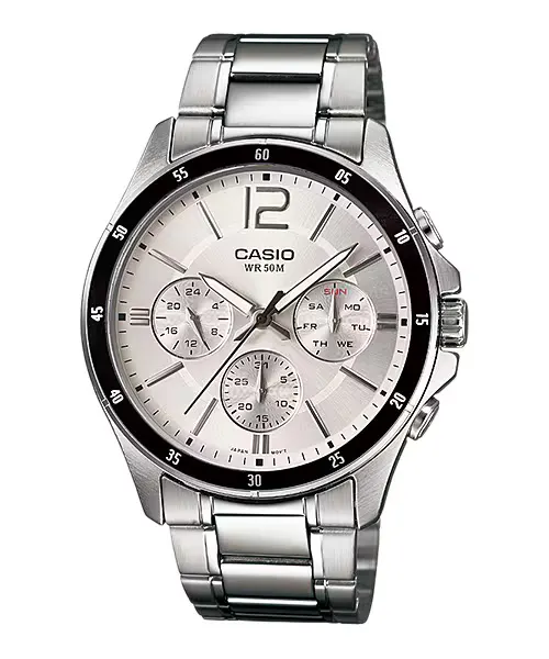 Циферблат Casio MTP-1374D-7A показывает время в 12- и 24-часовом формате. Есть защищённая заводная головка и сразу три дополнительных циферблата для отображения дня недели, даты и 24 часов. Прикрывает их минеральное стекло, устойчивое к царапинам. Влагозащиты в 50WR хватит для мытья рук или прогулок под дождём. Но главный козырь этой модели —цена.