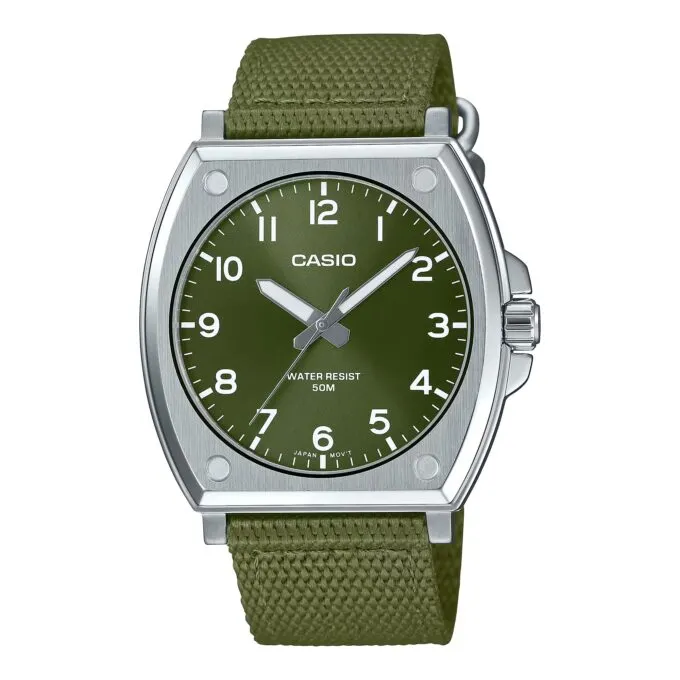 Классические мужские часы с «солнечным» циферблатом и текстильным ремешком — отличный вариант на лето. Casio MTP-E730C-3A — универсальная модель в классическом корпусе, которые легко вписываются как в деловой, так и повседневный стиль. Внутри установлен надёжный кварцевый механизм, который обеспечивает точную работу, а батареи хватает на три года. Циферблат выполнен по технологии Sunray, создающей эффект солнечных лучей под разными углами освещения. Он прикрыт минеральным стеклом.