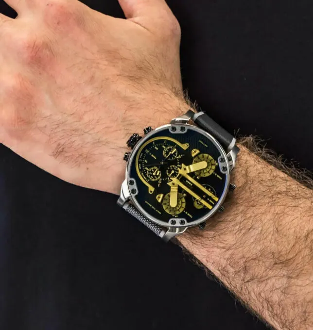 Diesel DZ7429 — массивные и выразительные часы, созданные для тех, кто не боится выделяться. Модель из линейки Mr. Daddy 2.0 сочетает в себе хронограф, четыре независимых часовых пояса и агрессивный дизайн с технологичными акцентами. Это не просто часы, а полноценный инструмент для путешественника, бизнесмена и любителя нестандартных аксессуаров.