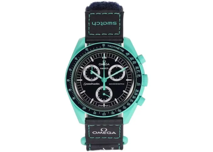 Вы видели модель MoonSwatch Mission on Earth: Polar Lights в цвете «бирюзовый авантюрин»? Очень нестандартный взгляд на легендарные Speedmaster, но на лето — просто шикарные часики. Производитель описывает Polar Lights как визуальный эксперимент, вдохновлённый сиянием полярных небес. Бирюзовый корпус из биокерамики в сочетании с тёмно-синим циферблатом с серебристыми вкраплениями создаёт эффект авантюрина, поэтому каждый экземпляр уникален. Вся палитра выдержана в холодных тонах, включая бирюзовые стрелки, тахиметрическую шкалу на синем безеле и VELCRO-ремешок с контрастной строчкой.