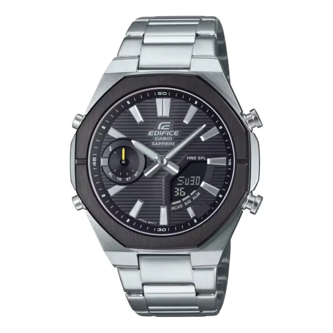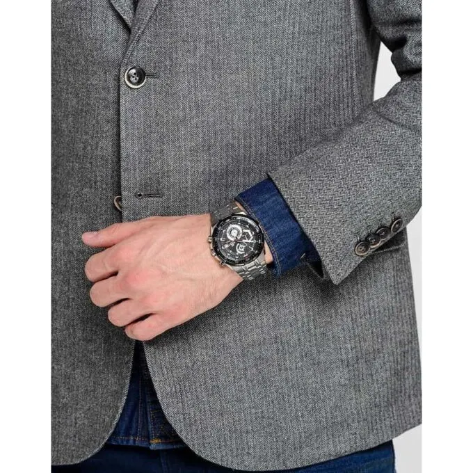 Один из самых солидных девайсов этой подборки — Casio Edifice EFR-539D-1A. Здесь уже полноценный хронограф, массивный корпус, сапфировое стекло и стальной браслет. Часы выглядят дорого и уместно даже с пиджаком. Модель оборудована двумя независимыми измерительными системами и стрелками с люминесцентным покрытием.
