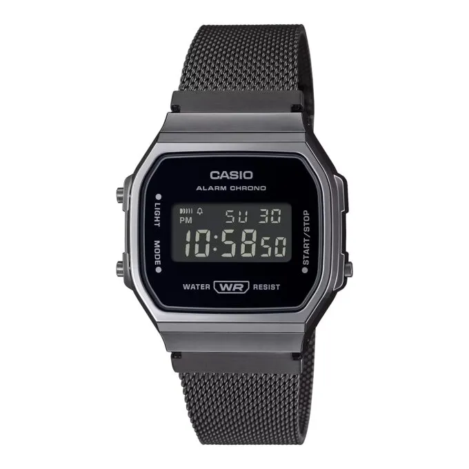 Casio A168WEMB-1B — идеальный выбор для тех, кто ценит винтажную эстетику. Эти часы возвращают в эпоху 90-х с их минималистичным прямоугольным дисплеем и металлическим браслетом в дизайне миланская петля. Простая индикация, ретро-подсветка, будильник, секундомер с точностью показаний 1/100с и SPLIT-хронограф — в них есть всё нужное для повседневного использования. А главное — долговечность: батареи хватает на 7 лет.