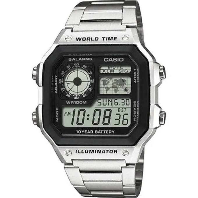 Casio Illuminator AE-1200WHD-1A — культовая модель Casio Royale с отсылкой к шпионским фильмам. Здесь уже больше функций: мировое время, пять будильников, таймер, секундомер и шикарная влагозащита 100WR. При этом батарея держит до 10 лет.