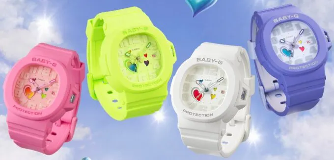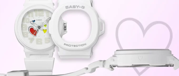 G-Shock BGA-10 получили квадратный безель с сильным скруглением, цифровой циферблат и функцию календаря. Под циферблатом находятся несколько сердечек, цвет которых можно менять. Под ними расположен градиентный круг, который вращается с поворотом коронки.