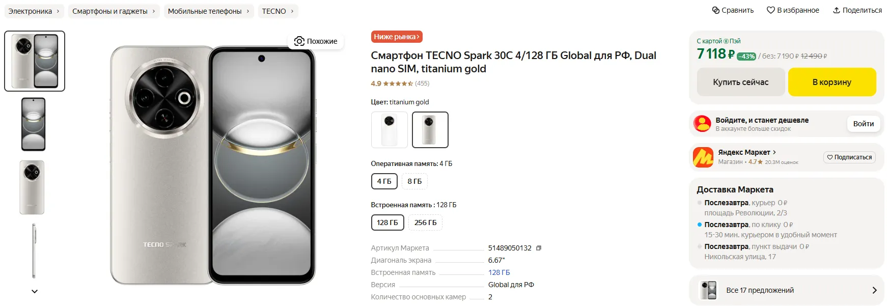 Заметили, что на Маркете серьезно подешевел Tecno Spark 30C — этот смартфон входит в наш топ-5 лучших смартфонов до 10 тысяч, поэтому про скидку мы просто обязаны рассказать. Сейчас за девайс просят всего 7 190 рублей.