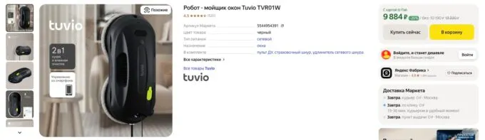 Прямо сейчас робота-мойщика окон Tuvio TVR01W можно урвать на Яндекс Маркете за 9884 рубля. А с кэшбеками некоторых банков он обойдётся ещё дешевле.