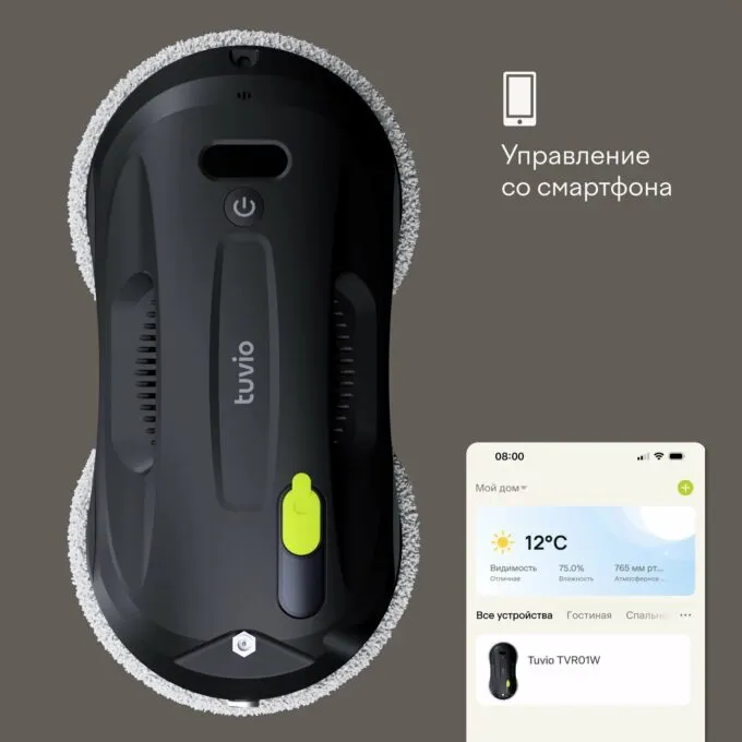 Робот Tuvio TVR01W управляется либо через приложение, либо с пульта. В арсенале — три автоматических режима движения. Вода подаётся автоматически из резервуара на 40 мл. Сразу отметим, что подоконники заливать он не будет — подача довольно аккуратная, а микрофибровые насадки работают без разводов и риска поцарапать стекло. Работает девайс от сети, но если электричество обрубят, девайс останется на месте до 20 минут благодаря резервному аккумулятору. Так что вы успеете его снять.