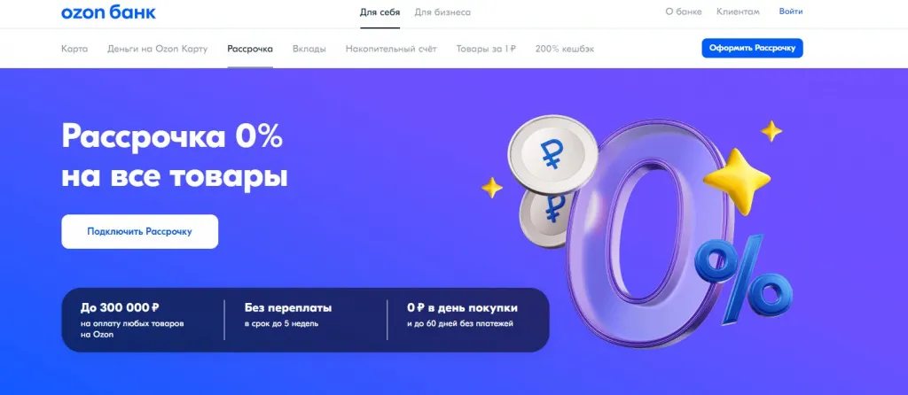 - Рассрочку выдает собственный банк. Условия довольно простые — 0 рублей в момент покупки, без переплат, если погасить рассрочку в течение 5 недель. В противном случае Ozon будет брать доплату за каждый месяц. Можно растянуть рассрочку на срок до 24 месяцев.