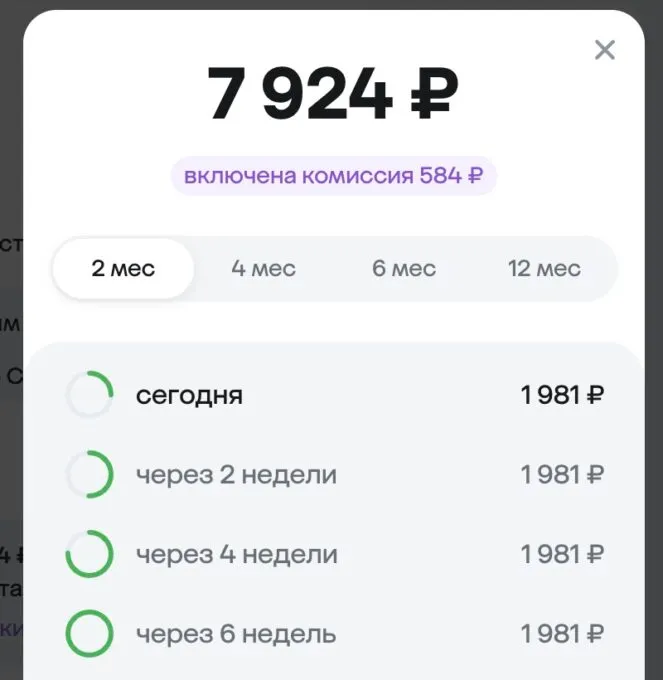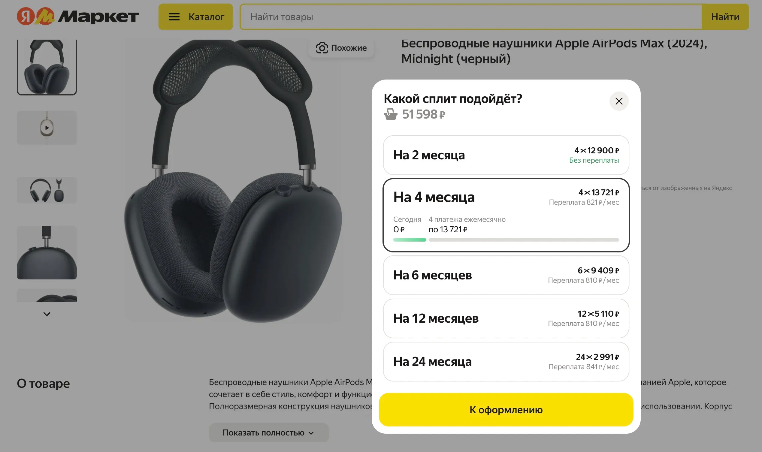 - Судя по гайду, беспроцентных рассрочек маркетплейс не выдает. Если берешь на 2 месяца, то переплата составит 8% от стоимости товара, 4 месяца — 10%, 6 месяцев — 15%.