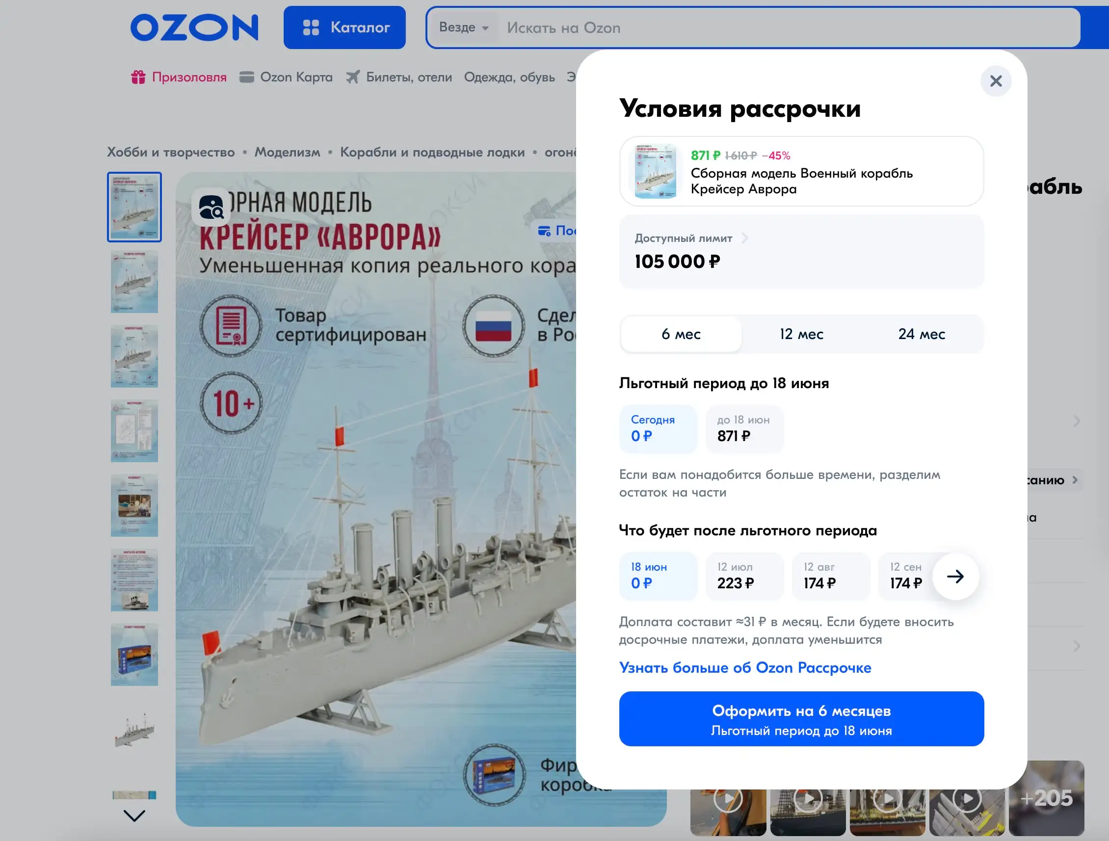 - Лимит денег, который маркетплейс может занять клиенту, рассчитывается индивидуально. Перед первым подключением рассрочки нужно отправить запрос в Ozon (теоретически сервис может отказать).