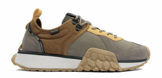 Теперь взгляните на коричневые кроссовки от культового французского бренда. Это демисезонная мид-модель Troop Runner, оснащенная термопластичной амортизирующей подошвой. Верх выполнен из текстиля, а рисунок протектора создает идеальной сцепление с дорогой. Недаром в начале своей истории марка Palladium создавала шины для самолетов.