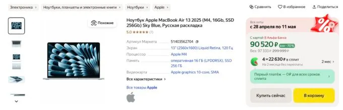 - MacBook Air 13 M4 (16/256 Гбайт) — 90 500 рублей. Прошлый месяц — 135 600 рублей