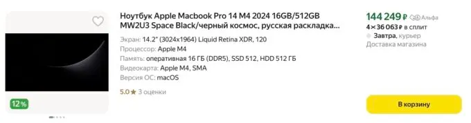 - MacBook Pro 14 M4 (16/512 Гбайт) — 144 300 рублей, прошлый месяц — 190 000 рублей