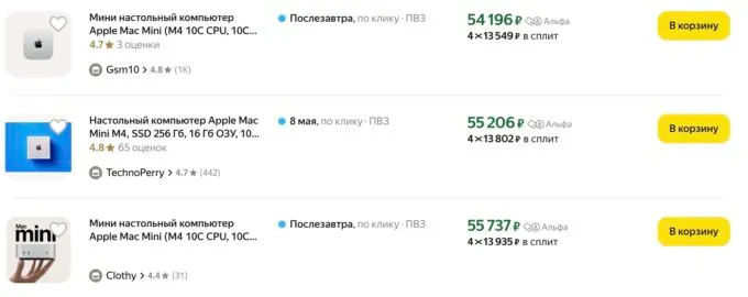 - Mac mini M4 (16/256 Гбайт) — 54 200 рублей, прошлый месяц — 60 000 рублей