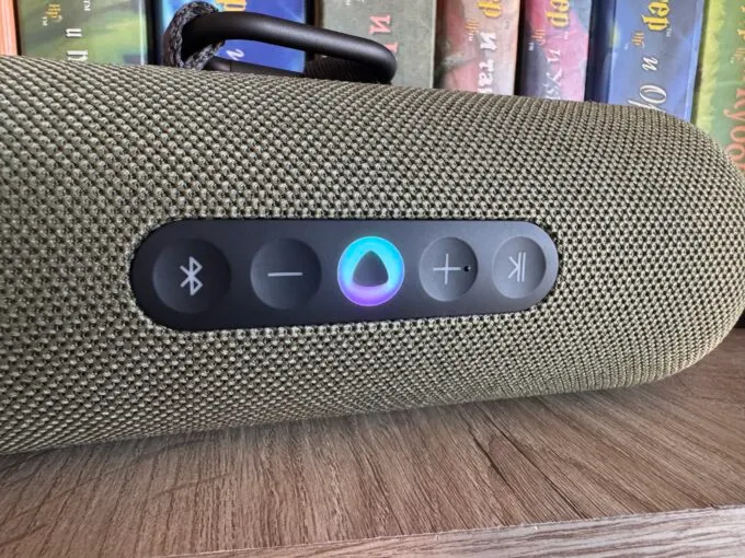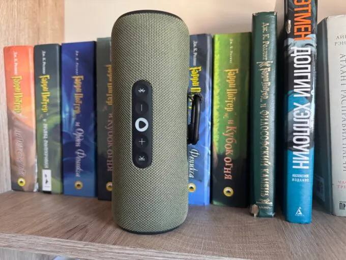 Мне досталась именно зеленая Станция — опять же, оттенок скорее нейтральный и приглушённый, а мне такое нравится. Корпус обтянут приятной на ощупь тканью. Ничего не скользит, поэтому держать девайс в руках удобно — вряд ли он внезапно выскользнет у вас из рук при переноске. А чтобы этого точно не случилось, можно воспользоваться ремешком с карабином. Аксессуар есть в комплекте, за это респект.