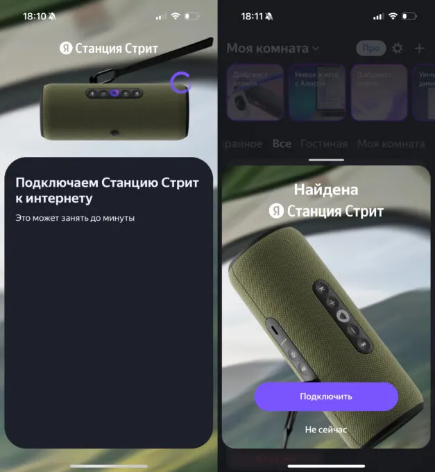 Понравилось, что активация довольно простая. Распаковал девайс, включил его, зашёл в приложение «Дом с Алисой», нажал на кнопку «Подключить» в моментально всплывшем окне, выбрал свою точку Wi-Fi, дождался обновления прошивки. И, по сути, всё — после этого спокойно приступил к использованию.