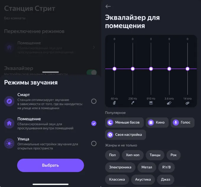 Конечно же, в приложении можно покопаться в настройках эквалайзера. Если вы не любите это делать или не понимаете, как и что лучше настроить (прямо как я), то для вас есть шаблоны под разные сценарии использования. Причём колонка может сама определять место, в котором она находится — и в зависимости от этого корректировать настройки звучания. Это реально удобно.