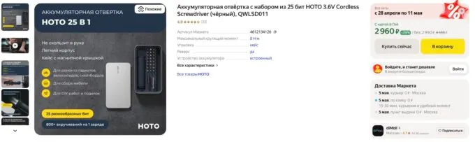 Обычно за Hoto Cordless Screwdriver просят около 6 тысяч, но сейчас на Яндекс Маркете топовую электроотвёртку Xiaomi можно забрать за 2960 рублей. Также не забывайте, что многие банки готовы отсыпать кэшбек за покупки на этой платформе.