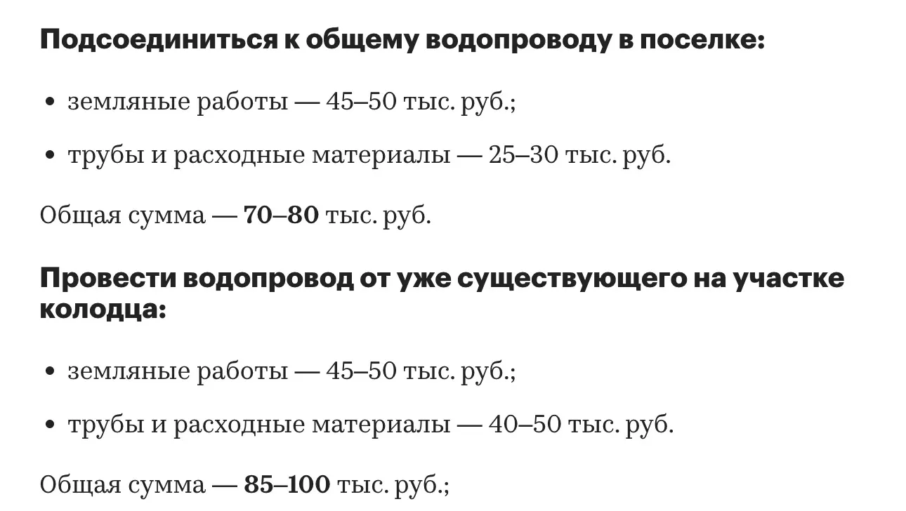 Если без газа еще можно обойтись (с помощью электричества), то без воды — вообще никак. У собственника есть два варианта — подключиться к централизованному водоснабжению или пробурить на участке скважину. Хорошо, что подключение к воде — не самая жирная статья расходов. Эксперты РБК рассчитали, что при наличии линии рядом с участком можно уложиться в 100 тысяч рублей вместе с работами.