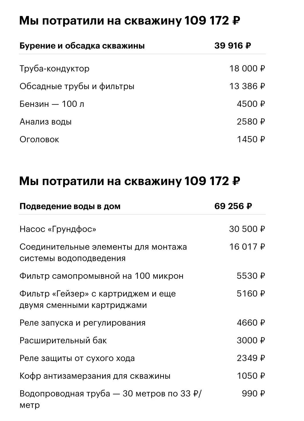 Так, в 2020 году эксперт «Т—Ж» потратил на обустройство скважины 110 тысяч рублей. Скорее всего, сейчас на весь процесс уйдет больше — 200 или 300 тысяч рублей.