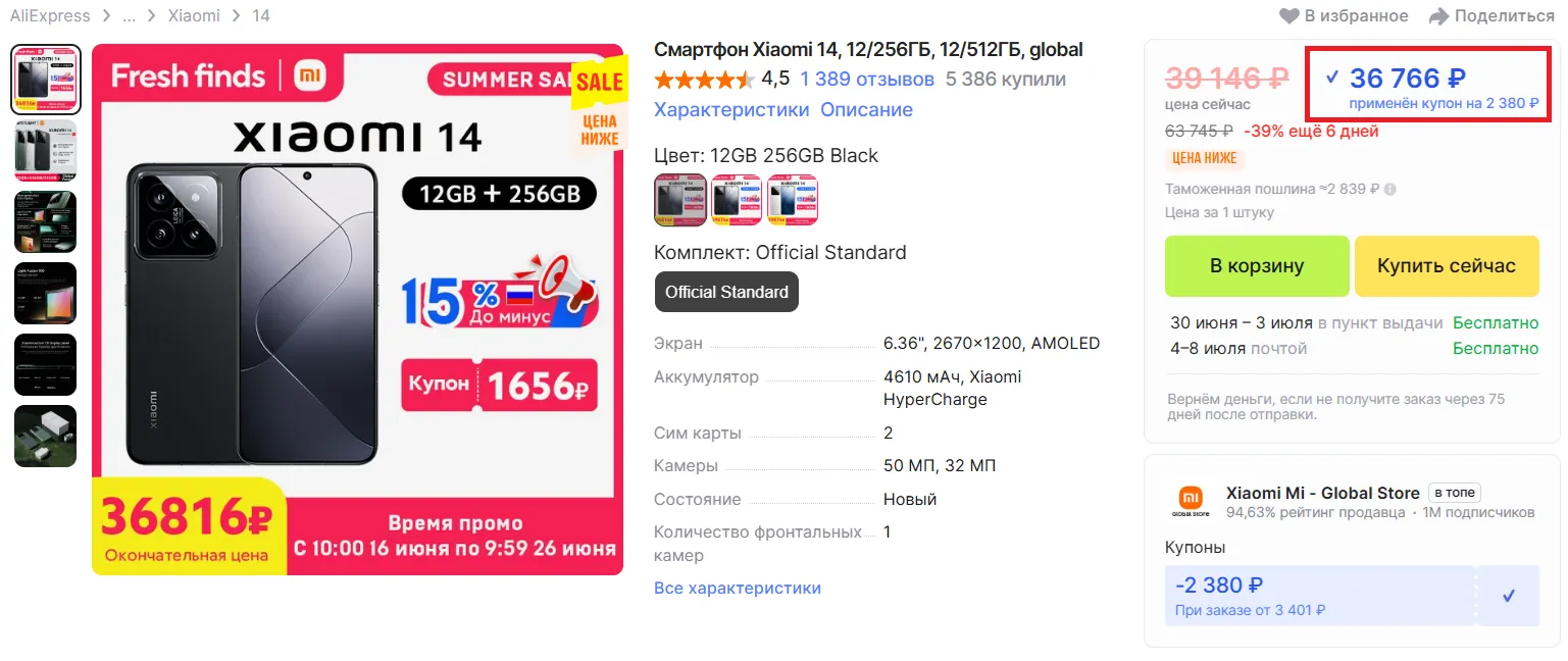 В России за «четырнадцатый» просят не меньше 63 тысяч. На Али даже с учетом таможенной пошлины смарт обойдется примерно в 39,5К — выгода очевидна. Главное не забыть взять купон продавца перед оформлением заказа.