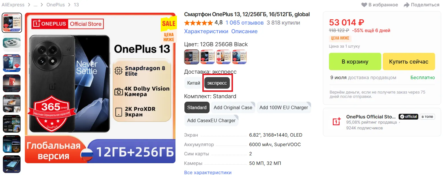 Главное преимущество лота — экспресс-доставка со склада в РФ, пошлину оплачивать не придется. Для сравнения, на Маркете смартфон дороже на 10 кэсов.