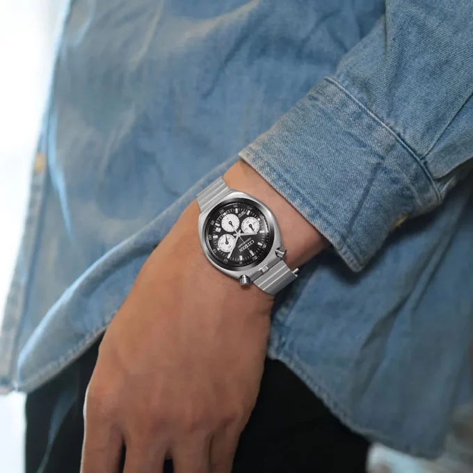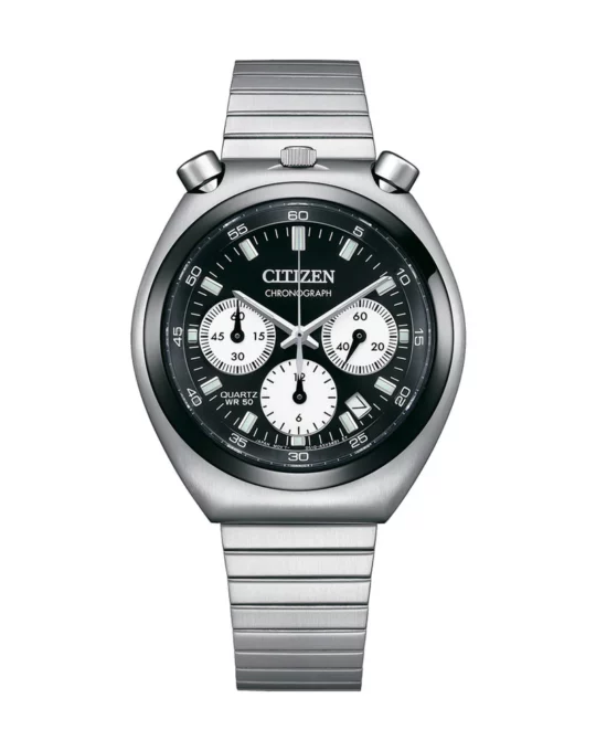 Очередной шедевр от японских часоделов — Citizen Bullhead AN3660-81E. Одна из самых узнаваемых моделей бренда, классика среди мужских кварцевых хронографов. Особенность дизайна — кнопки и заводная головка, вынесенные в верхнюю часть корпуса, как у спортивных хронографов 70-х. Корпус из нержавеющей стали с чёрным IP-покрытием по безелю подчёркивает винтажный характер модели.
