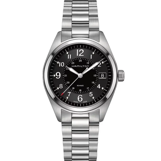 В модели Hamilton Khaki Field H68551933 выдержан идеальный баланс между милитари-стилем, максимальной точностью и швейцарским качеством. Часы построены на базе надёжного кварцевого механизма с автоматическим календарём, который всегда отображает актуальную дату. Ещё они отображают время в 12- или 24-часовом формате, что актуально как для повседневной носки, так и для использования в полевых условиях.