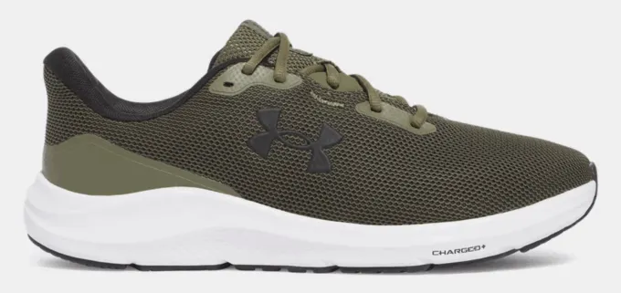 Как и обещали, начинаем с кроссовок из бюджетного сегмента. Это темно-зеленые Pursuit 4 с минималистичным дизайном – легкая и дышащая обувь, идеальная для начинающих спортсменов. Верх айтема выполнен из текстиля, а за амортизацию и поглощение ударных нагрузок здесь отвечает технологичная межподошва Charged+.