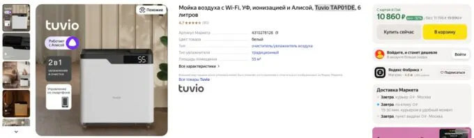 Прямо сейчас отличную мойку воздуха Tuvio TAP01DE можно урвать на Яндекс Маркете всего за 10 860 рублей, а с кэшбеком некоторых банков она обойдётся ещё дешевле.