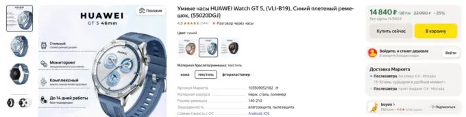 Сейчас флагманские часы Huawei Watch GT 5 можно приобрести на Яндекс Маркете всего за 14 840 рублей. Также не забывайте, что многие банки готовы отсыпать щедрый кэшбек за покупки на этой платформе.