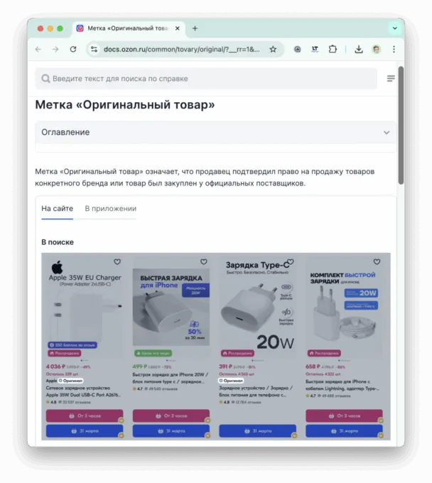 Даже на странице поддержки в нужном разделе Ozon демонстрирует на скриншотах явно фейковый товар: