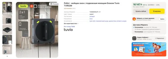 Сейчас робота-мойщика окон Tuvio TVR02W можно приобрести на Яндекс Маркете за 16 147 рублей. А с кэшбеками некоторых банков он обойдётся ещё дешевле.