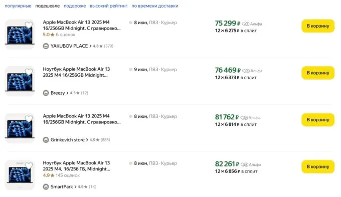- MacBook Air 13 M4 (16/256 Гбайт) — 75 300 рублей. Прошлый месяц — 90 500 рублей