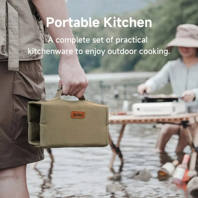 NexTool Outdoor Cooking Set NE20325 — компактный и практичный комплект кухонных инструментов, придуманный специально для вылазок на природу. Внутри этого чемоданчика в цвете хаки спрятаны шесть предметов: острый нож, мощные ножницы, щипцы, ложка, лопатка и пара палочек. Всё сделано из прочных и безопасных материалов — ножи из стали, а ложка с лопаткой — из термостойкого силикона. На этом практичность набора не заканчивается: щипцы могут заменить сразу три прибора — нож, вилку и открывашку, а ножницы быстро превращаются в два небольших ножа. Согласитесь, удобно и многофункционально.