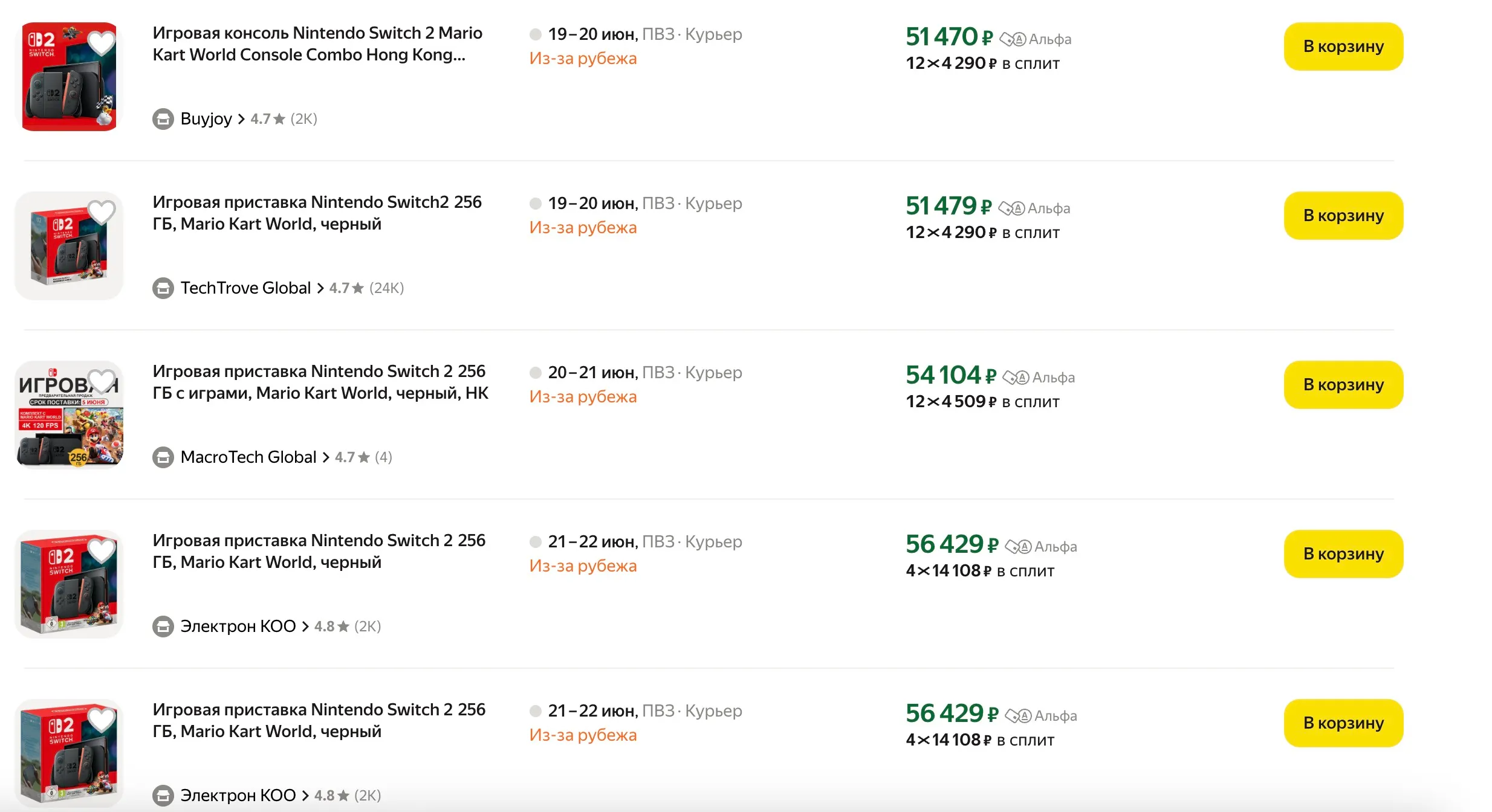 На Маркете второе поколение NS можно заказать за 52-57 тысяч рублей. Все предложения — от иностранных продавцов. Поэтому придется заплатить пошлину, минимум 6 тысяч рублей. Есть возможность заказать Switch 2 прямо из России за 70+ тысяч рублей. Но это плохая идея. Во-первых, переплата за срочность. Во-вторых, до 5 июня — это дата официального старта продаж — консоль не будет работать.