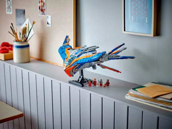 На полке он выглядит довольно убедительно: габариты — 19х32х20 см. Есть ключевые детали фильма, поэтому дальше всё зависит только от вашей фантазии. Пожалуй, это один из самых насыщенных комплектов в линейке Lego Marvel.