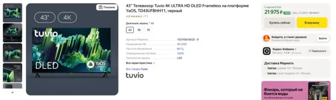 Прямо сейчас на Яндекс Маркете крутой смарт-ТВ Tuvio 4K Ultra HD DLED Frameless (TD43UFBHH11) можно забрать за 21 975 рублей. Также не забывайте, что некоторые банки готовы отсыпать щедрый кэшбек за покупку на этой платформе.
