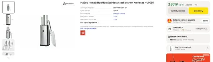 Теперь к главному — сейчас на Яндекс Маркете солидный набор ножей Xiaomi HuoHou Stainless Steel Kitchen Knife Set (HU0095) можно урвать за 2850 рублей, а с кэшбеком некоторых банков он обойдётся ещё дешевле.