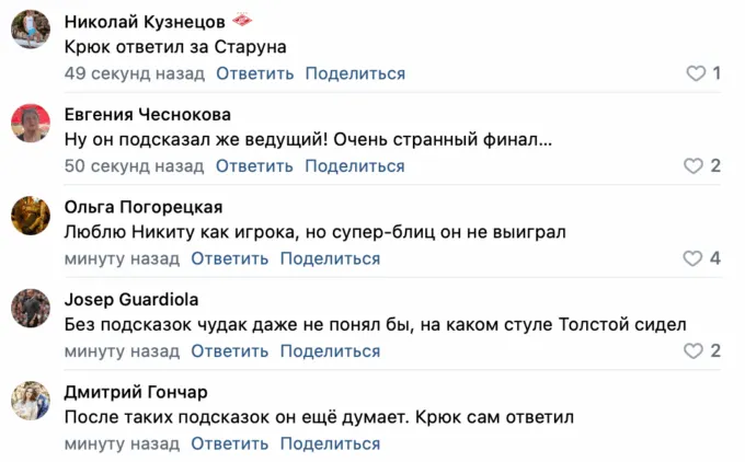 Знатоки победили со счетом 6:5, а Старун даже начал плакать от радости. Но многие зрители считают, что, несмотря на зрелищную игру, отдавать победу знатокам не стоило. Уж слишком откровенными и наглыми были подсказки Бориса Крюка.