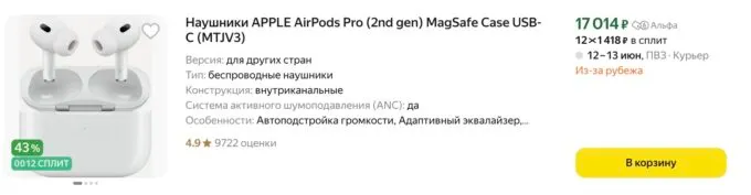- AirPods Pro 2 — от 18 900 рублей, прошлый месяц — 19 000 рублей